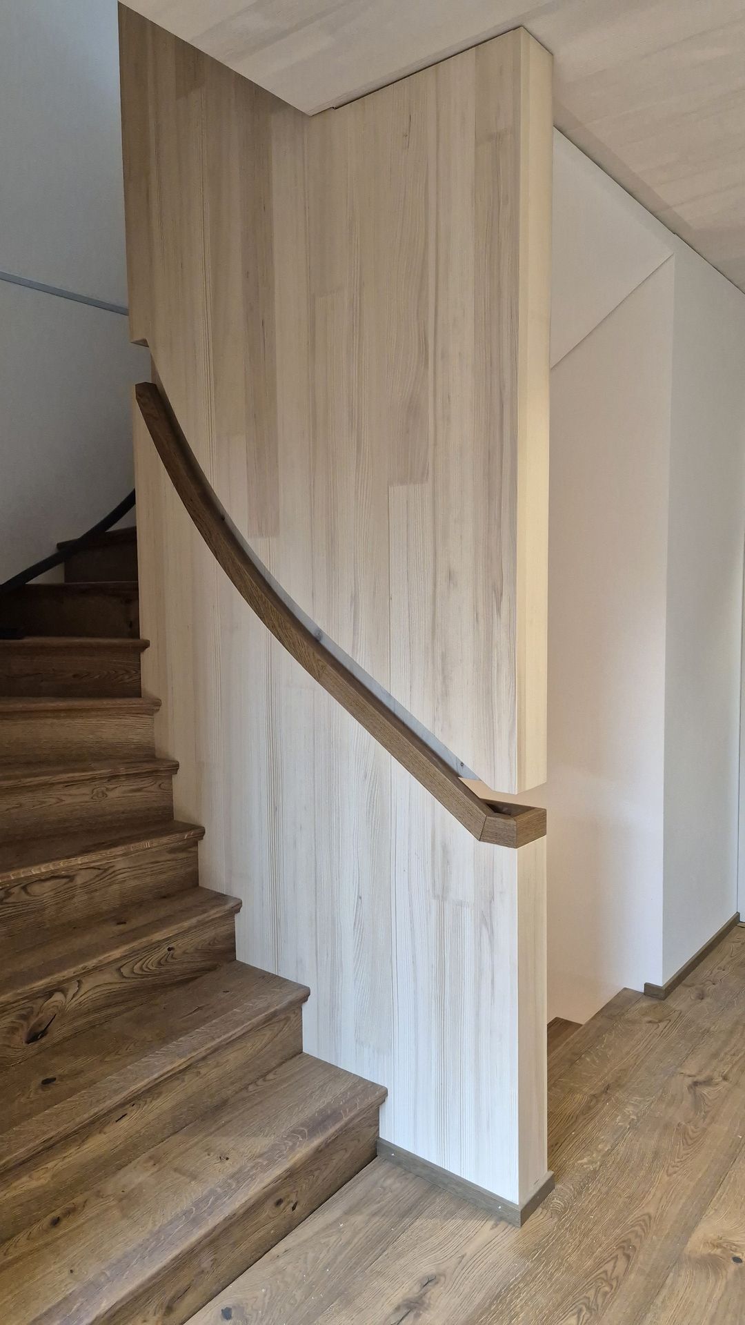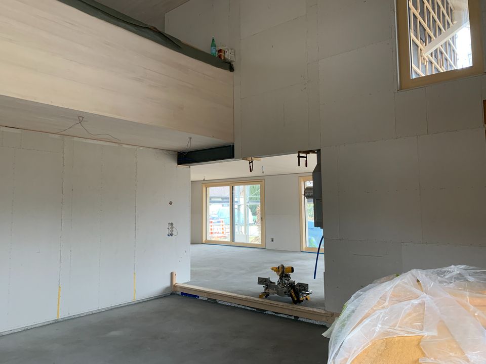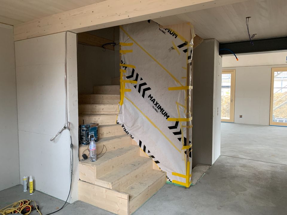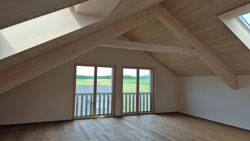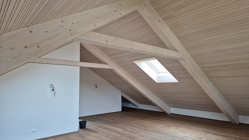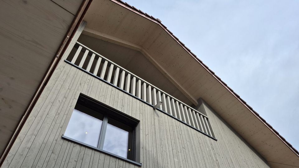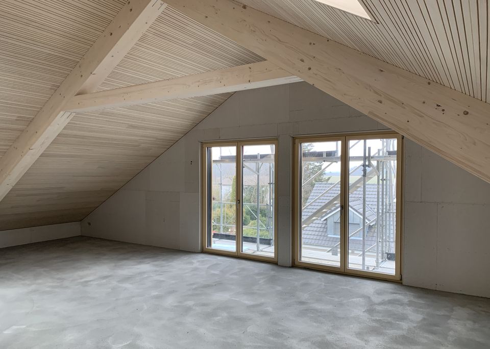 Für diesen Neubau durften wir die Baueingabe und die Bauleitung machen. Das Einfamilienhaus ist ein Holzbau über drei Geschosse mit vielen sichtbaren Holzelementen. Ein besonderer Hingucker ist das Wohnzimmer mit der Raumhöhe über zwei Geschosse und einem Erker der zum Lesen einlädt.