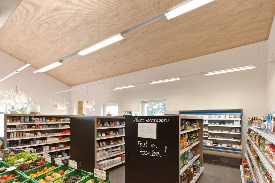 Das Sockelgeschoss wurde in gestocktem Kalkbeton, die oberen Geschosse als Holzelementbau ausgeführt. Die Dachschrägen wurden mit der hochwertigen Lignotrend-Decke ausgestattet. Diese Deckenverkleidung aus Holz schluckt den Schall und sorgt gleichzeitig für eine angenehme Atmosphäre.